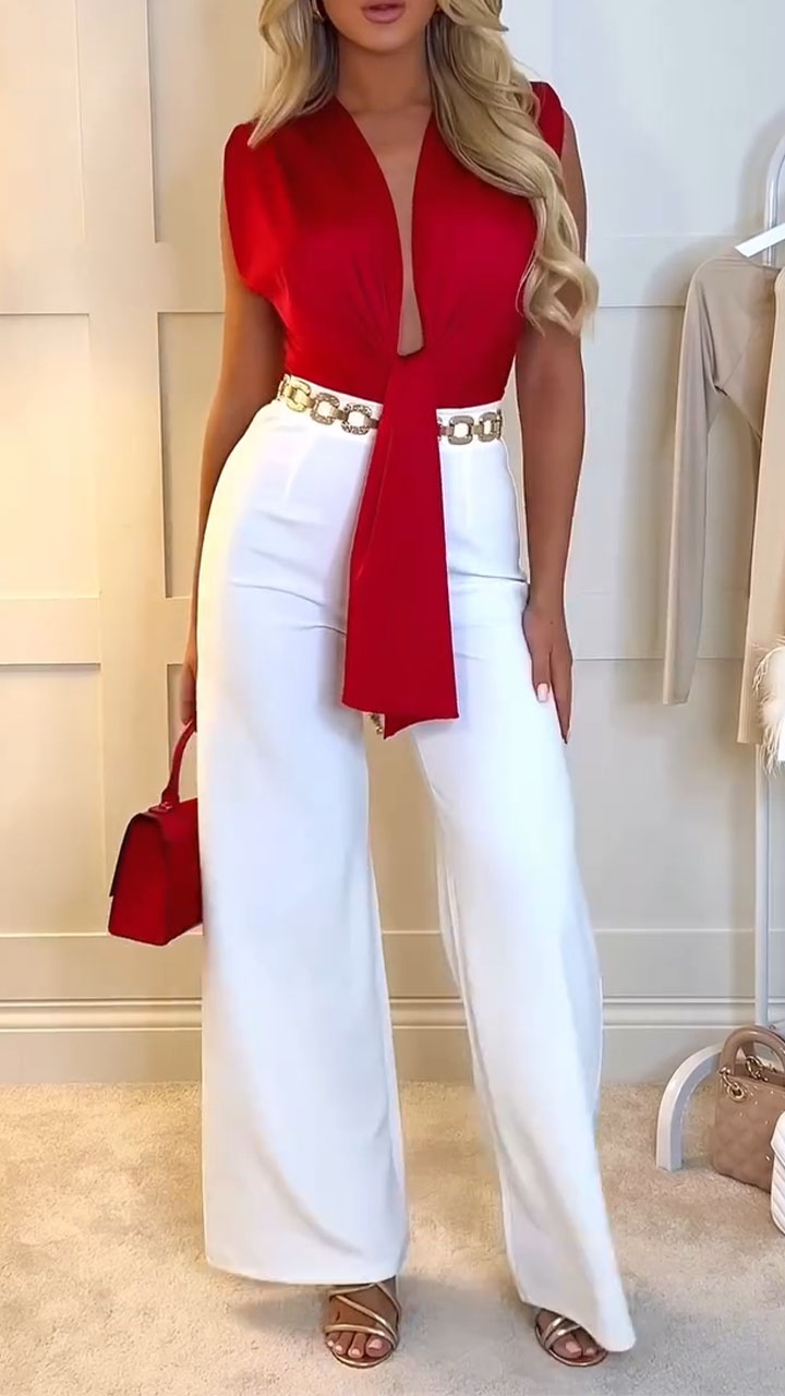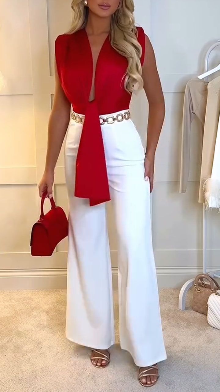 Women Deep V-neck Jumpsuit+ Pants Temperament Casual Suit
