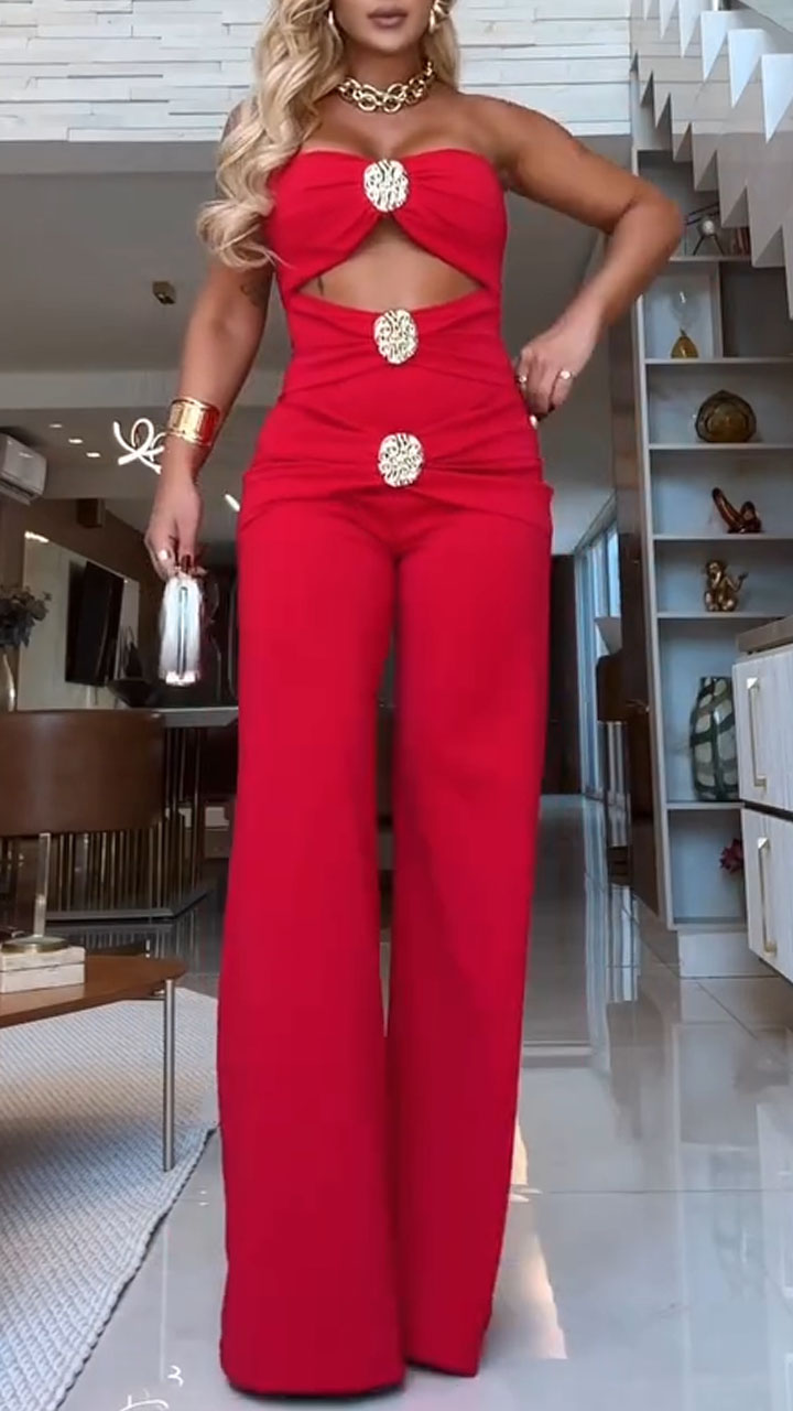 Women Strapless Hollow Metal Buckle Decoration Sexy Temperament Dinner Party Jumpsuit