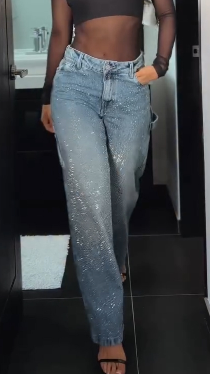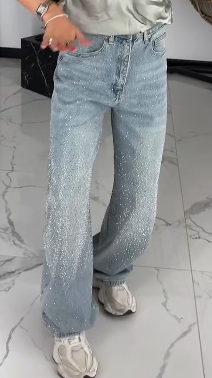 Women Hot Stamping Rhinestone Washed and Spliced Casual Jeans