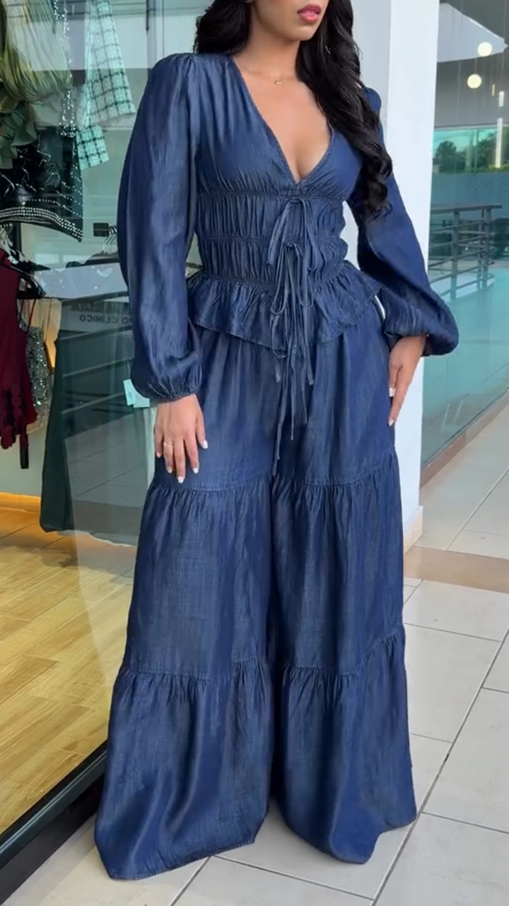 Women V-neck Fitted Top + Wide-leg Pants Solid Color Casual Set