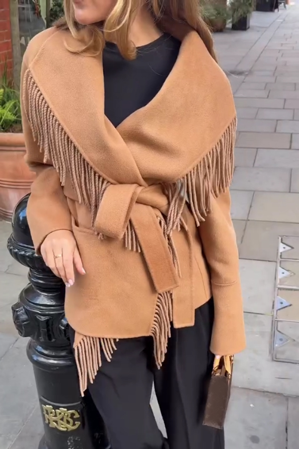Women Elegant Large Lapel Cross-Over Lace Tassel Coat