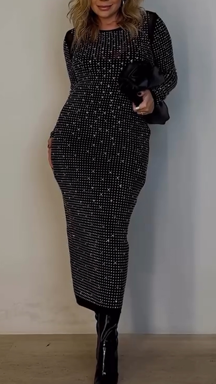 Women U-neck Hot Diamond Slimming Shining Temperament Casual Dress