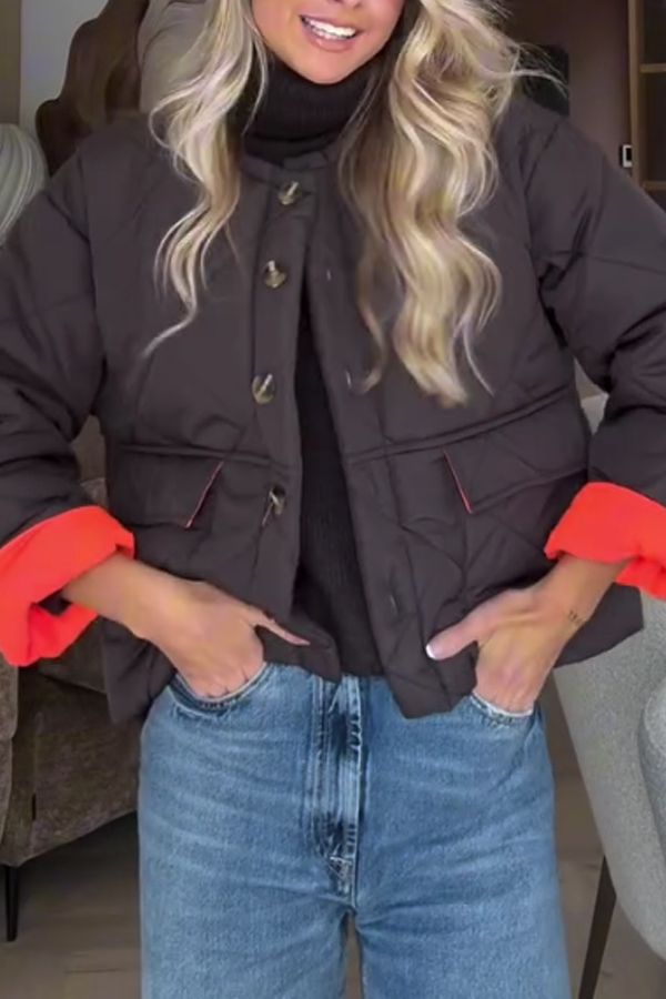 Women Casual Crew Neck Contrast Insulated Button Jacket