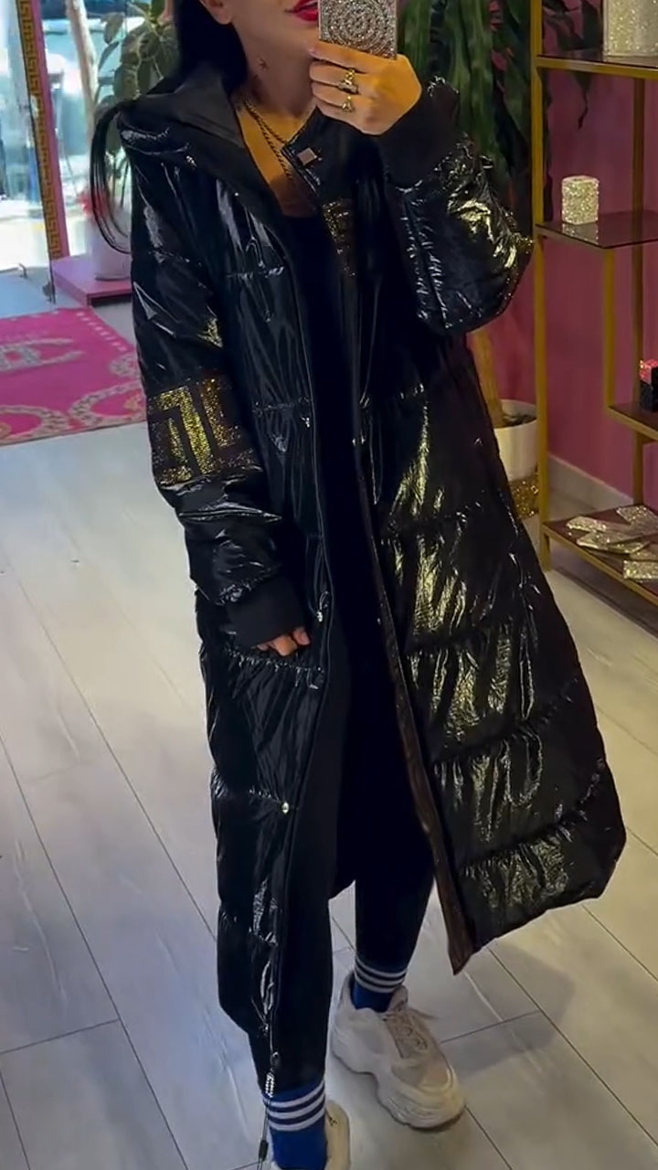 Women Hooded Patchwork Hot Stamping Printed Casual Long Cotton Jacket