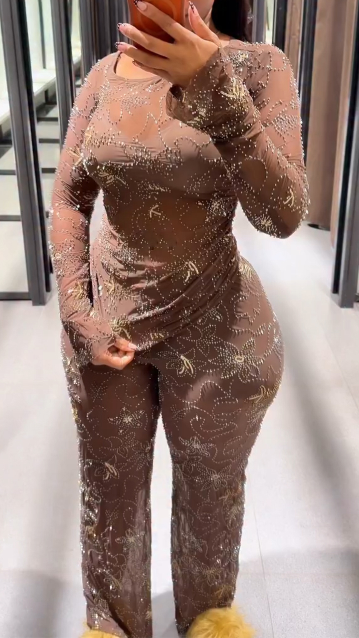 Women Lapel Rhinestone Flash Jacket + Spliced see-through Pants Temperament Casual Suit