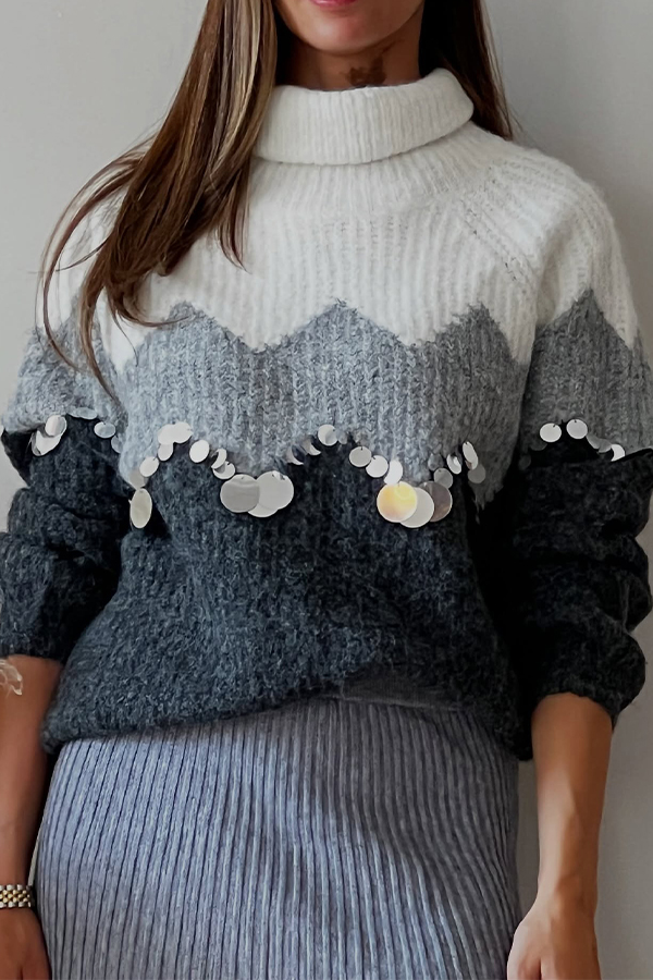 Women Casual Turtleneck Geometric Stripe Ombre Sequin Sweater