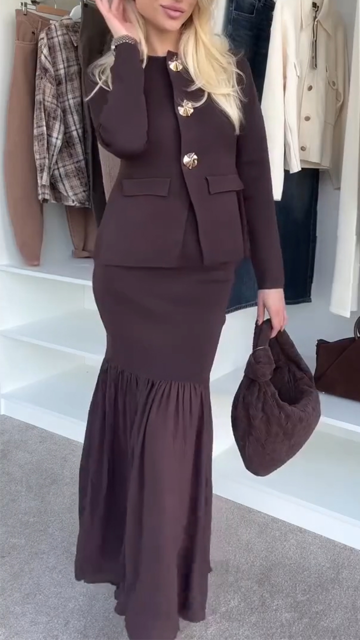Women Round Neck Buttoned Top + Spliced skirt Elegant Temperament Casual Suit