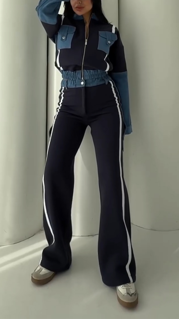 Women Standing Collar Patchwork Denim Jacket + Pants Casual Suit