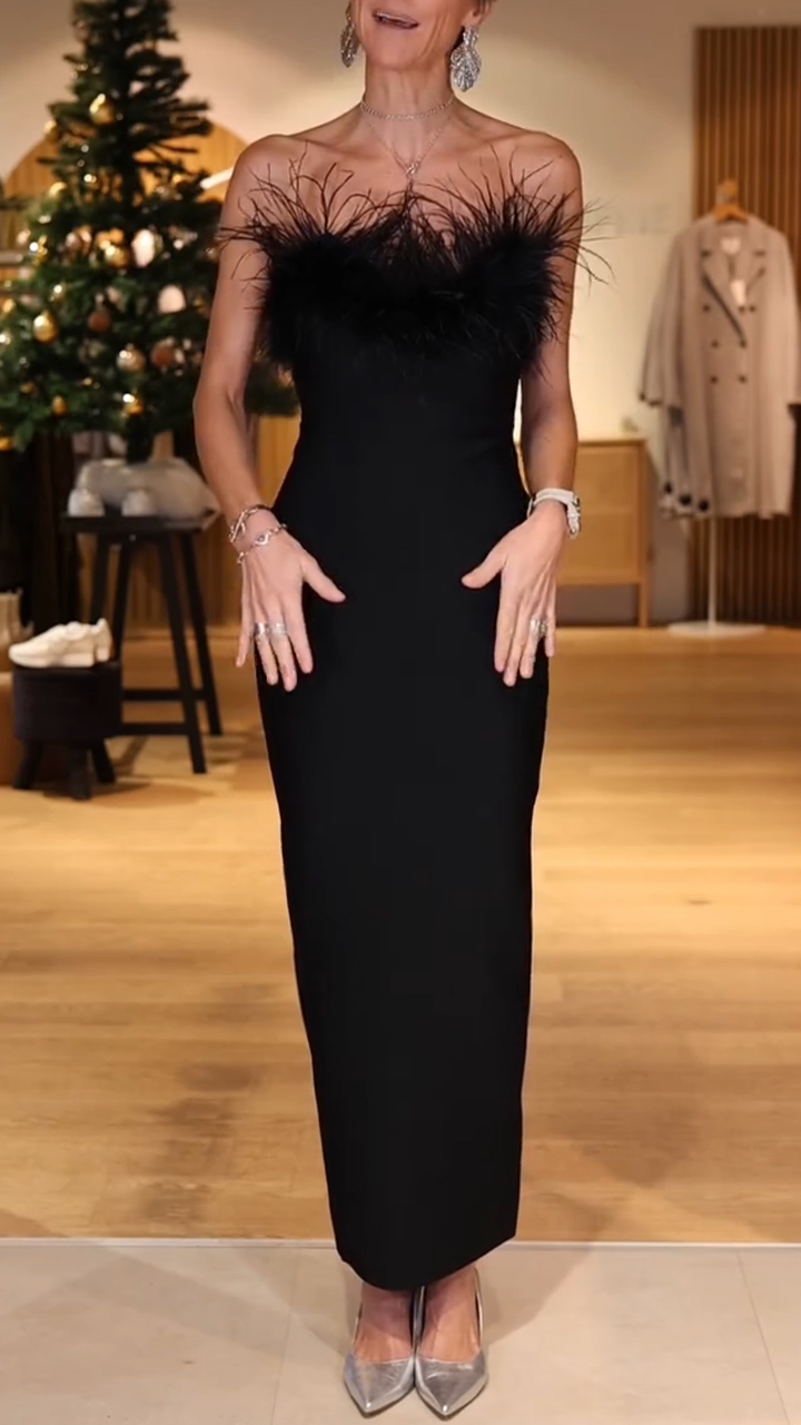 Women Strapless Woolen Strip Elegant Temperament Dinner Party Style Dress