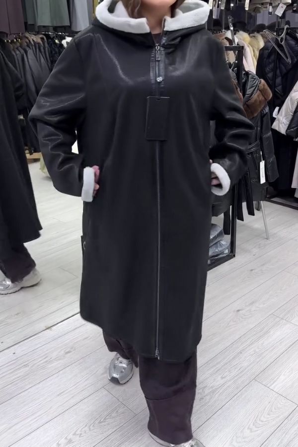 Women Casual Glossy Artificial Fur Collar Plush Splicing Hooded Zipper Slit Long Coat