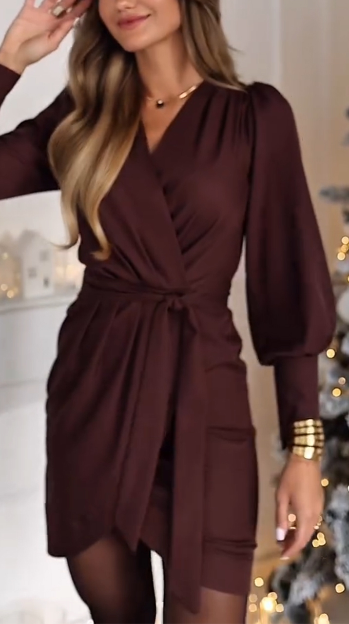 Women V-neck Solid Color Waist Strap Elegant Temperament Dress
