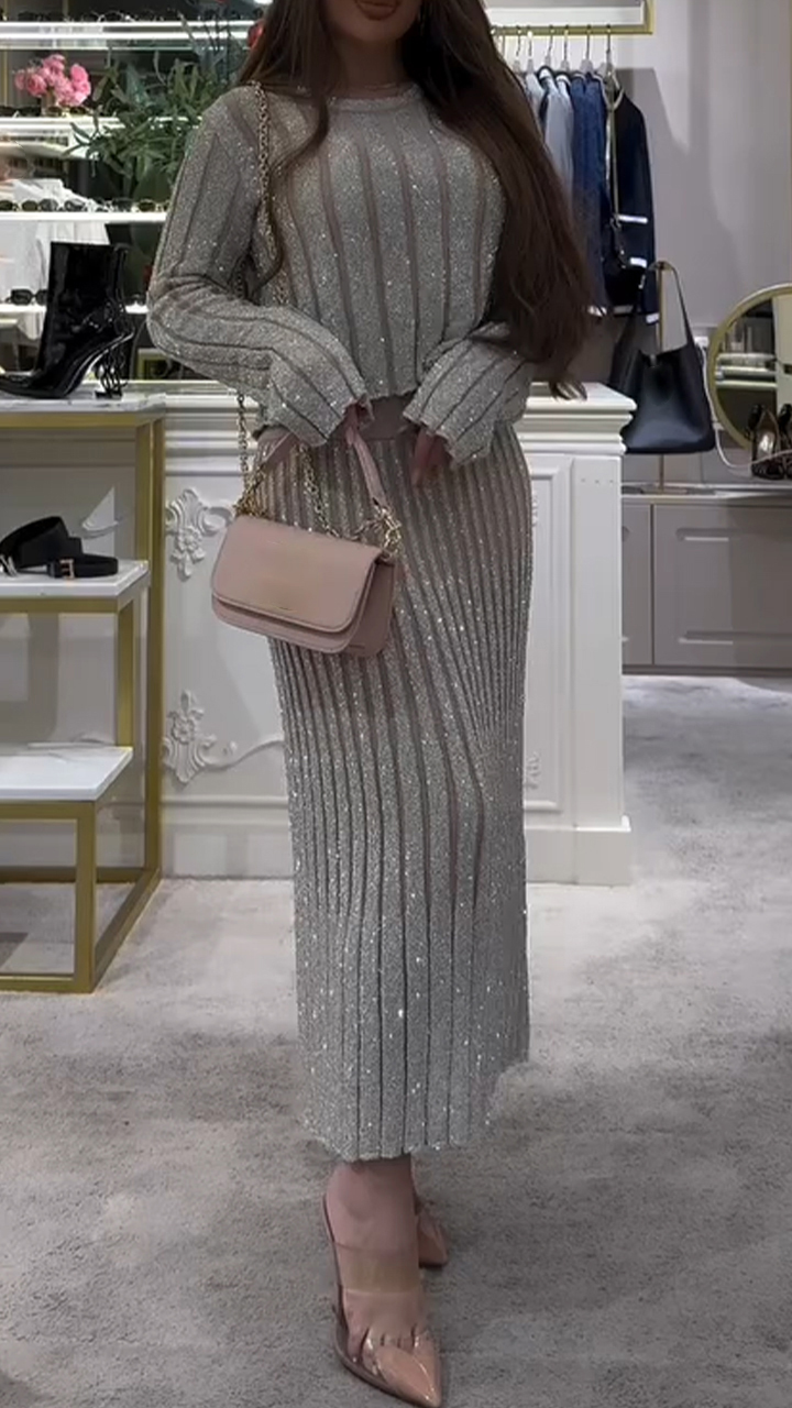 Women Round Neck Sequined Sweater+ Half Skirt Casual Set