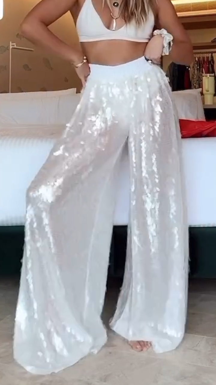 Women Round Neck Sequin Sparkling Casual Suit with Elegant Temperament