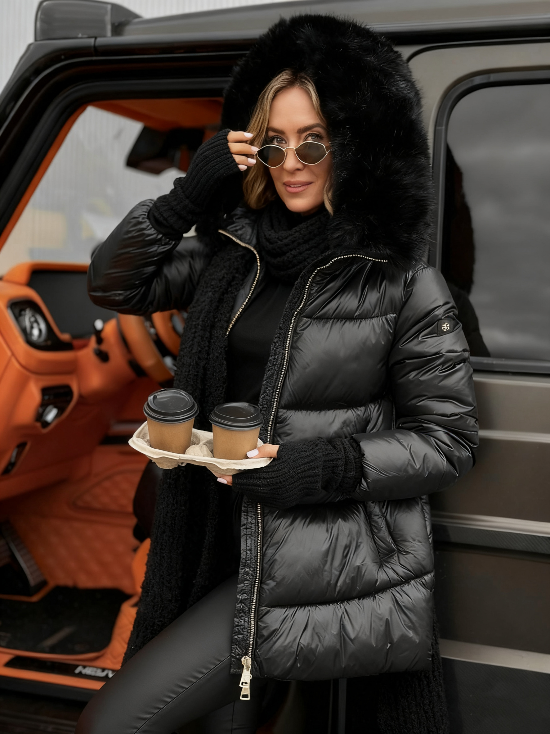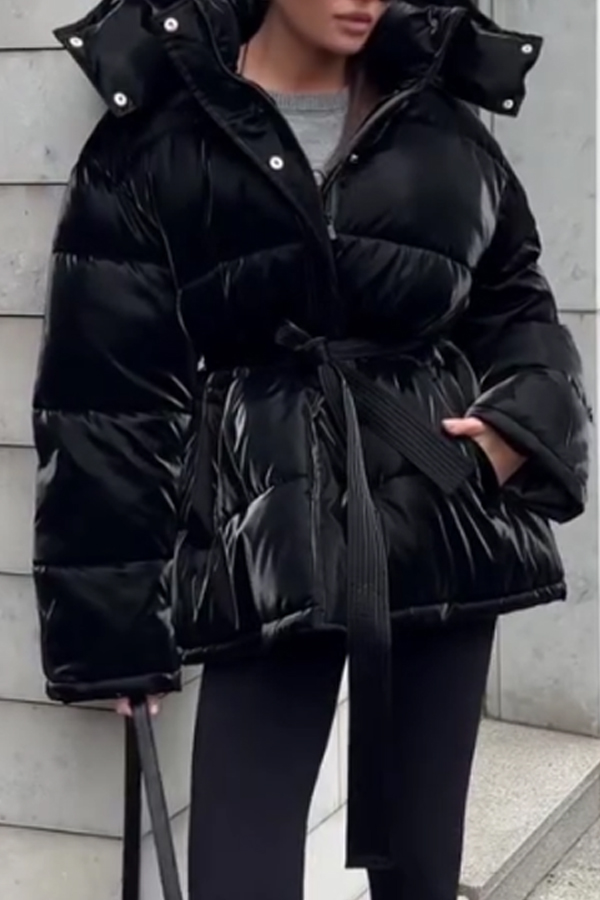 Women Casual Glossy Fabric High Neck Hooded Waist Tie Warm Jacket