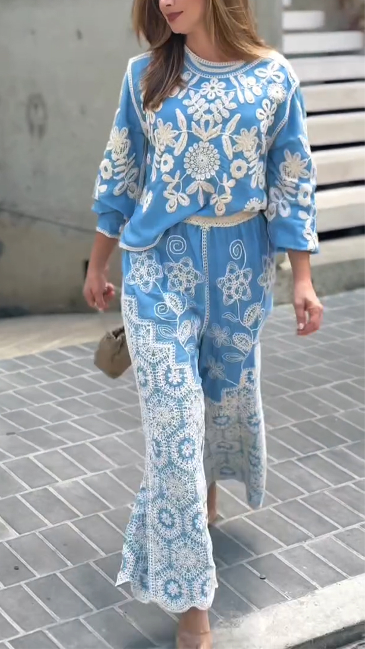 Women Round Neck Embroidered Printed Top + Pants Casual Suit