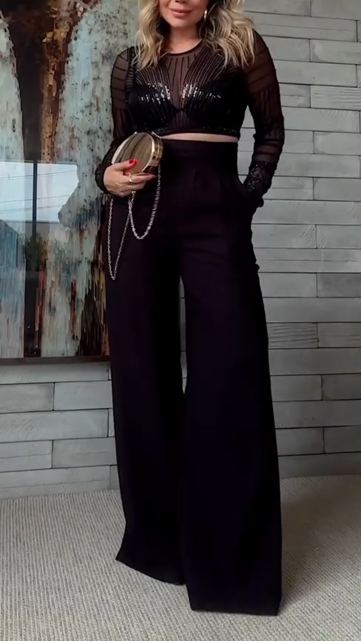 Women Round Neck Patchwork Sequin Printed Top+ Pants Casual Set