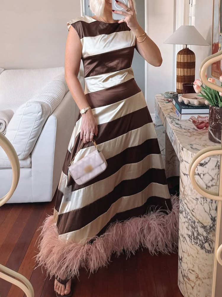 Women Round Neck Spliced Woolen Strip Elegant Temperament Dress