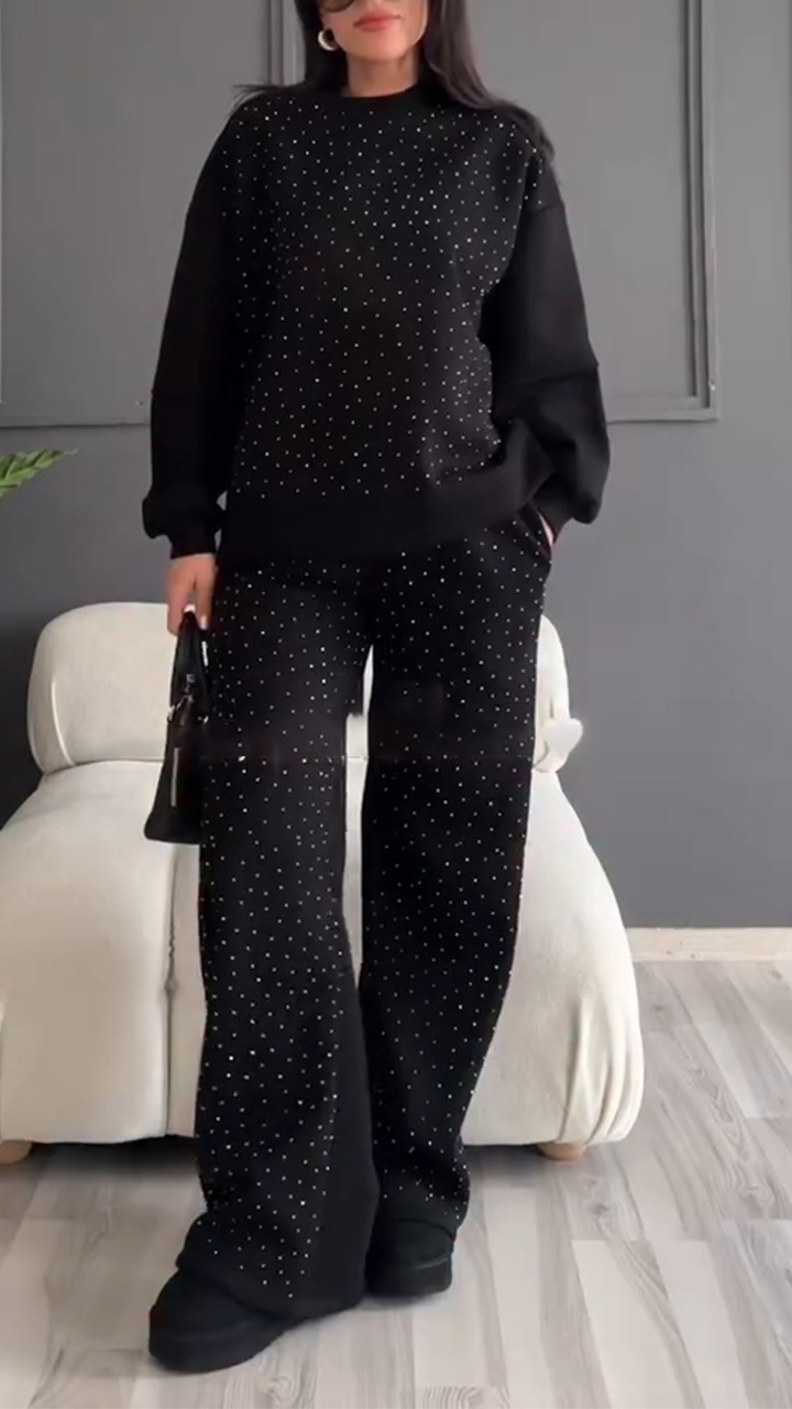 Women Round Neck Hooded Rhinestone Solid Color Casual Suit