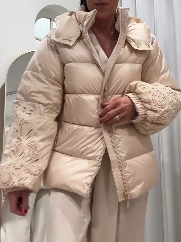 Women Casual Stand Collar Panel Lace-Up Warm Jacket