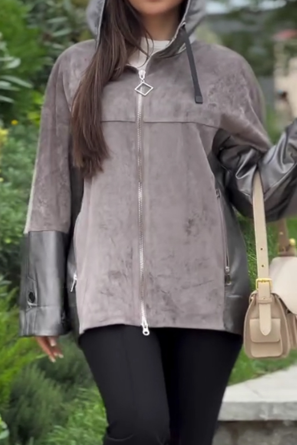 Women Casual Hooded Leather Panel Zipper Suede Windbreaker Jacket