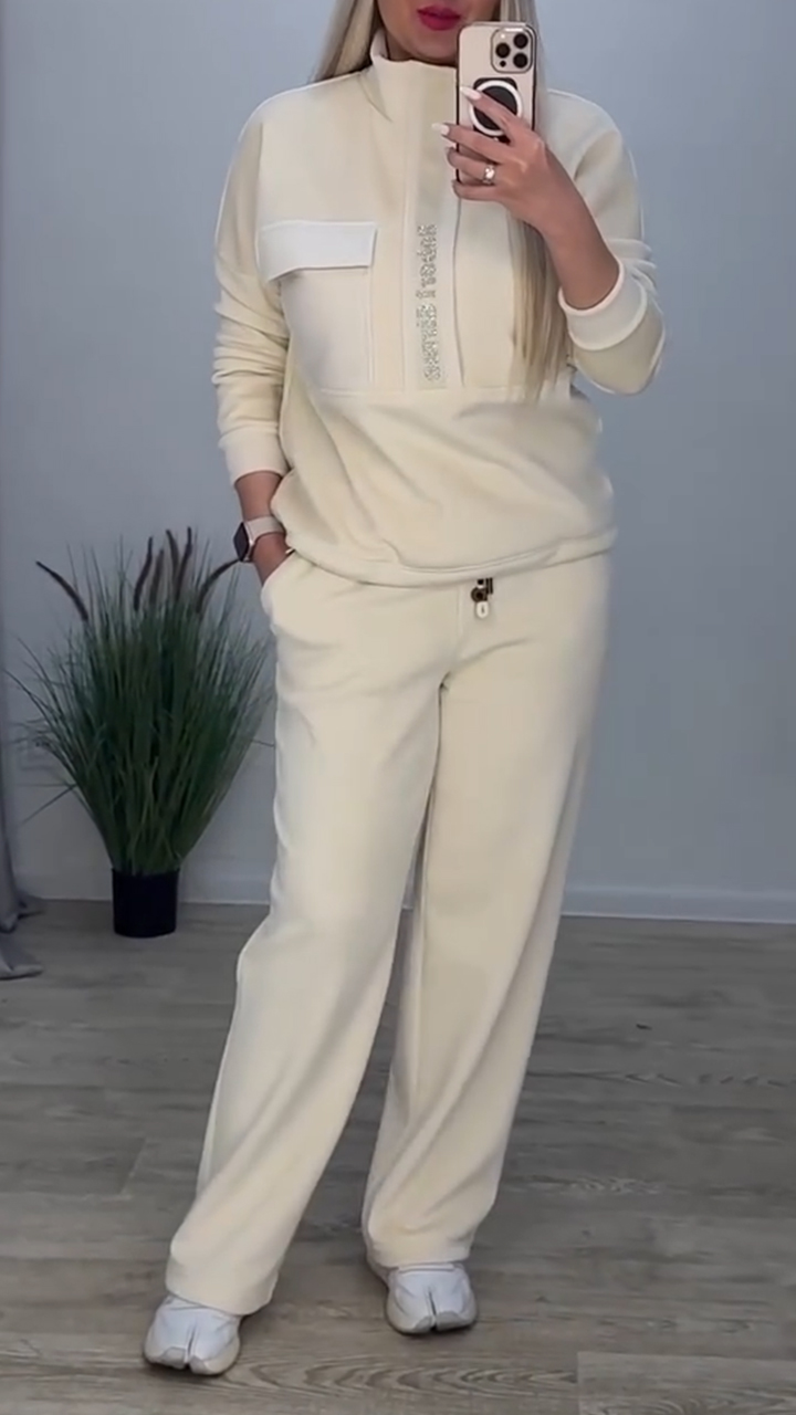 Women Stand-collar Patchwork Top and Pants Casual Set