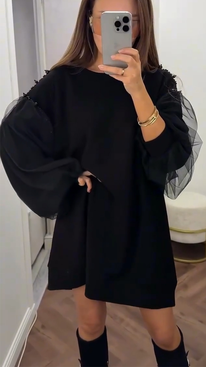 Ladies Round Neck Sleeve Patchwork Mesh Casual Dress
