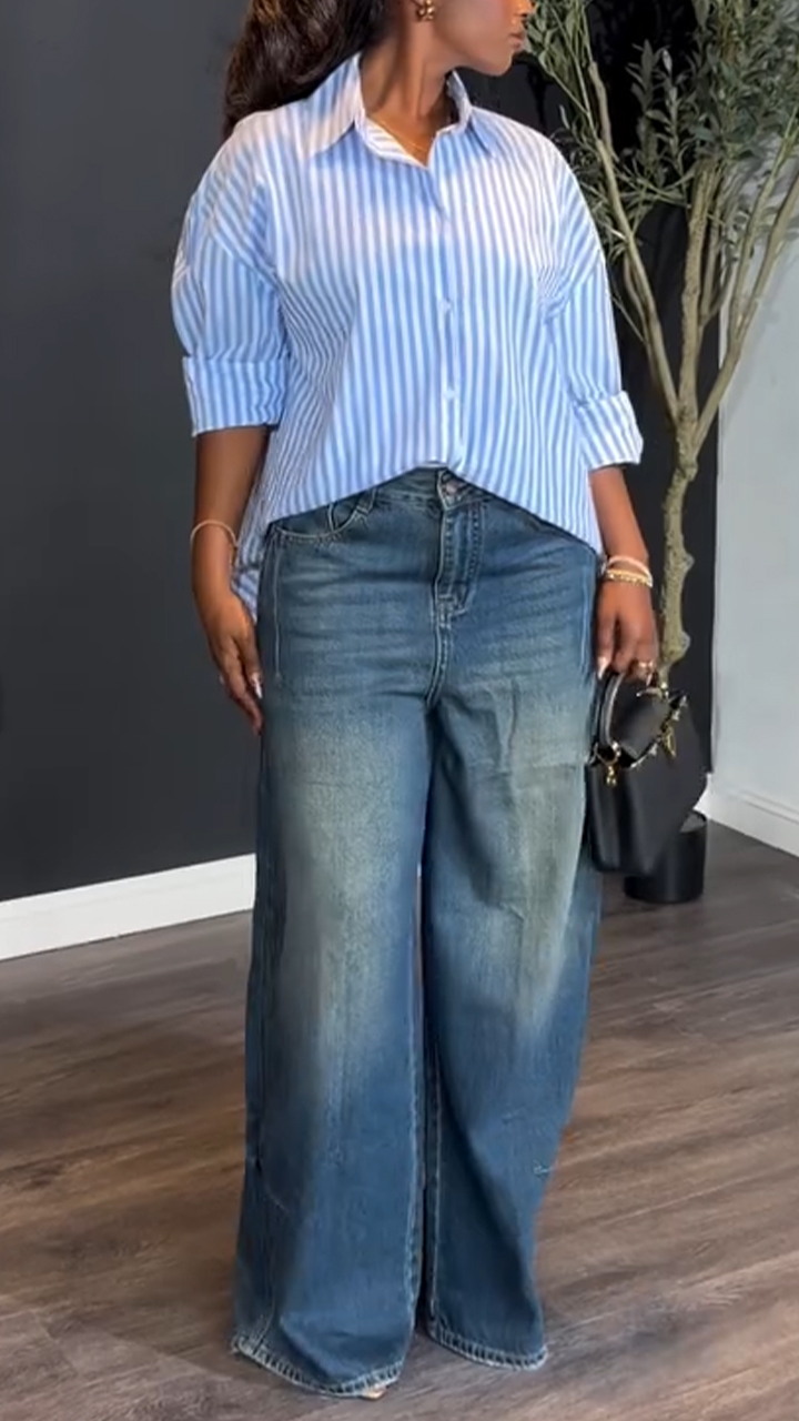 Women Laple Collar Vertical Striped Shirt+ Washed Denim Jeans Casual Set