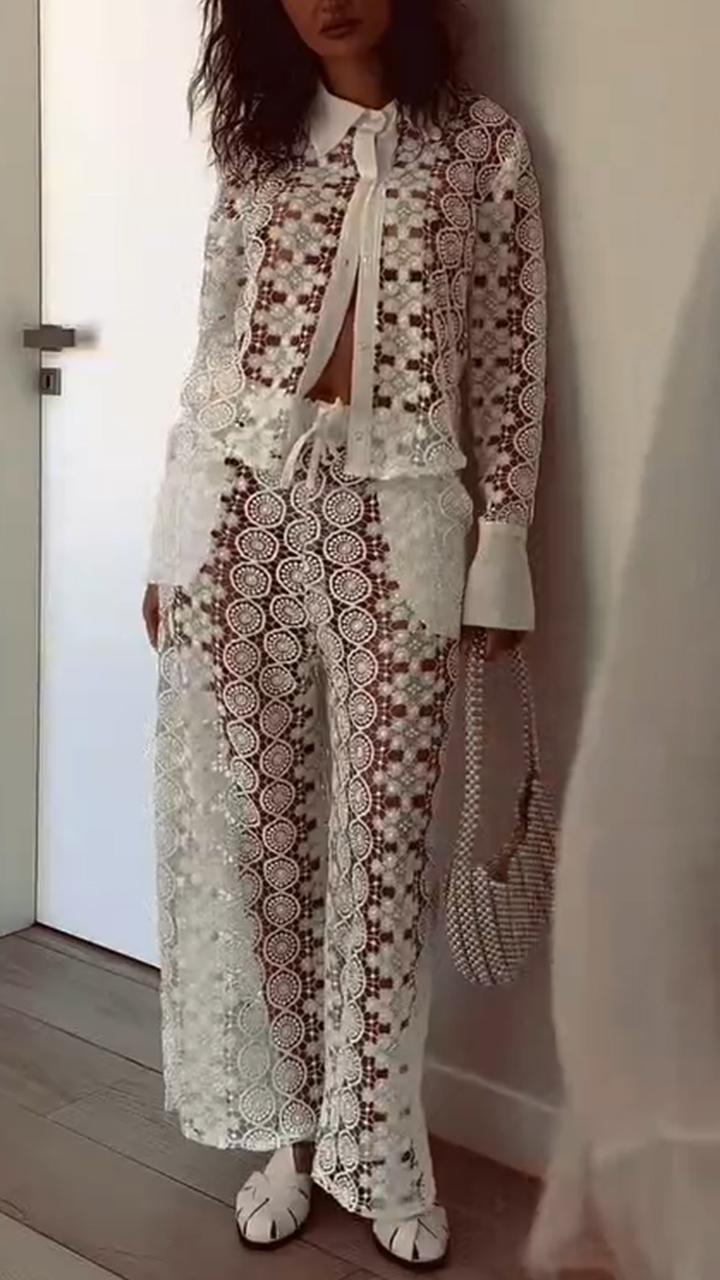 Ladies Lapel Pattern Hollowed Out Top+ Pants Casual Set