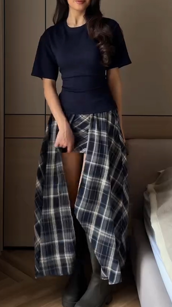 Women Round Neck Back Strap Top+ Patchwork Plaid Half Skirt Casual Set