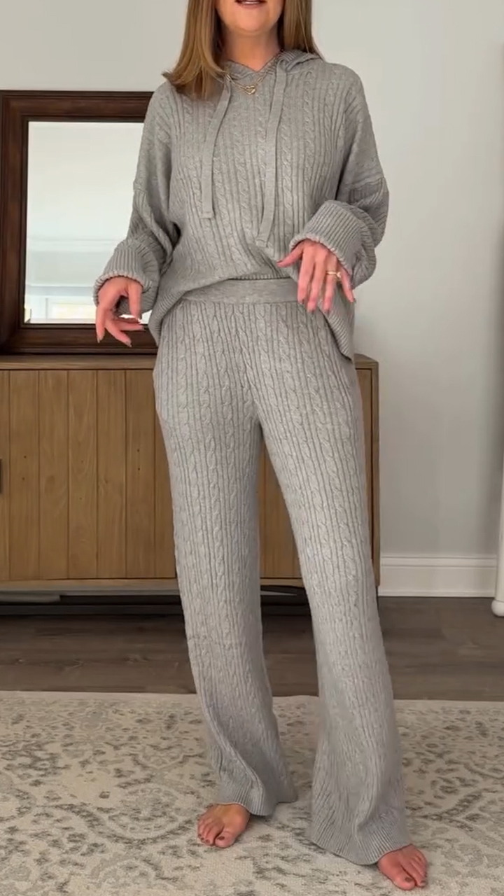 Women Round Neck Hooded Top+ Trousers Solid Casual Knitting Suit