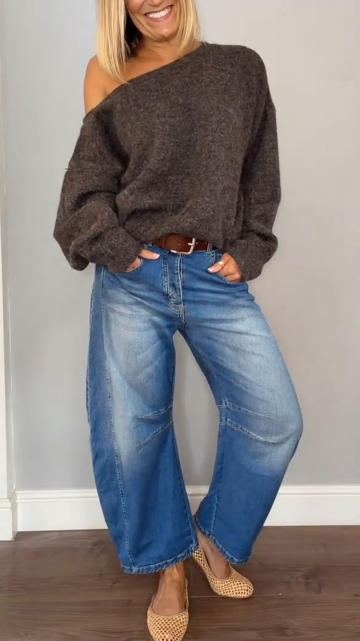 Women Diagonal Sweater+ Washed Denim Jeans Casual Set