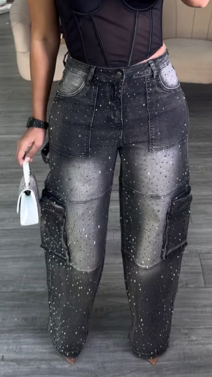 Women Patchwork Multi-pocket Hotfix Rhinestone and Washed Casual Jeans