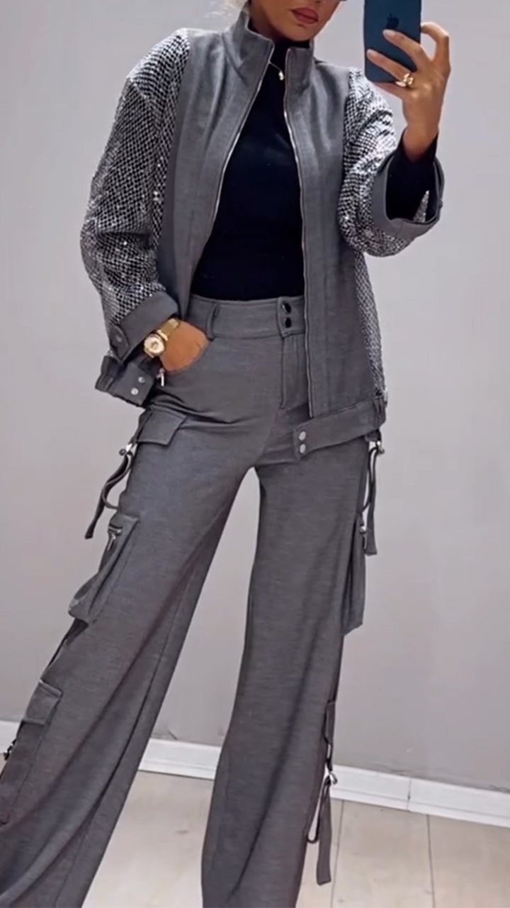 Women Stand-up Collar Openwork Jacket + Trousers Temperament Casual Set