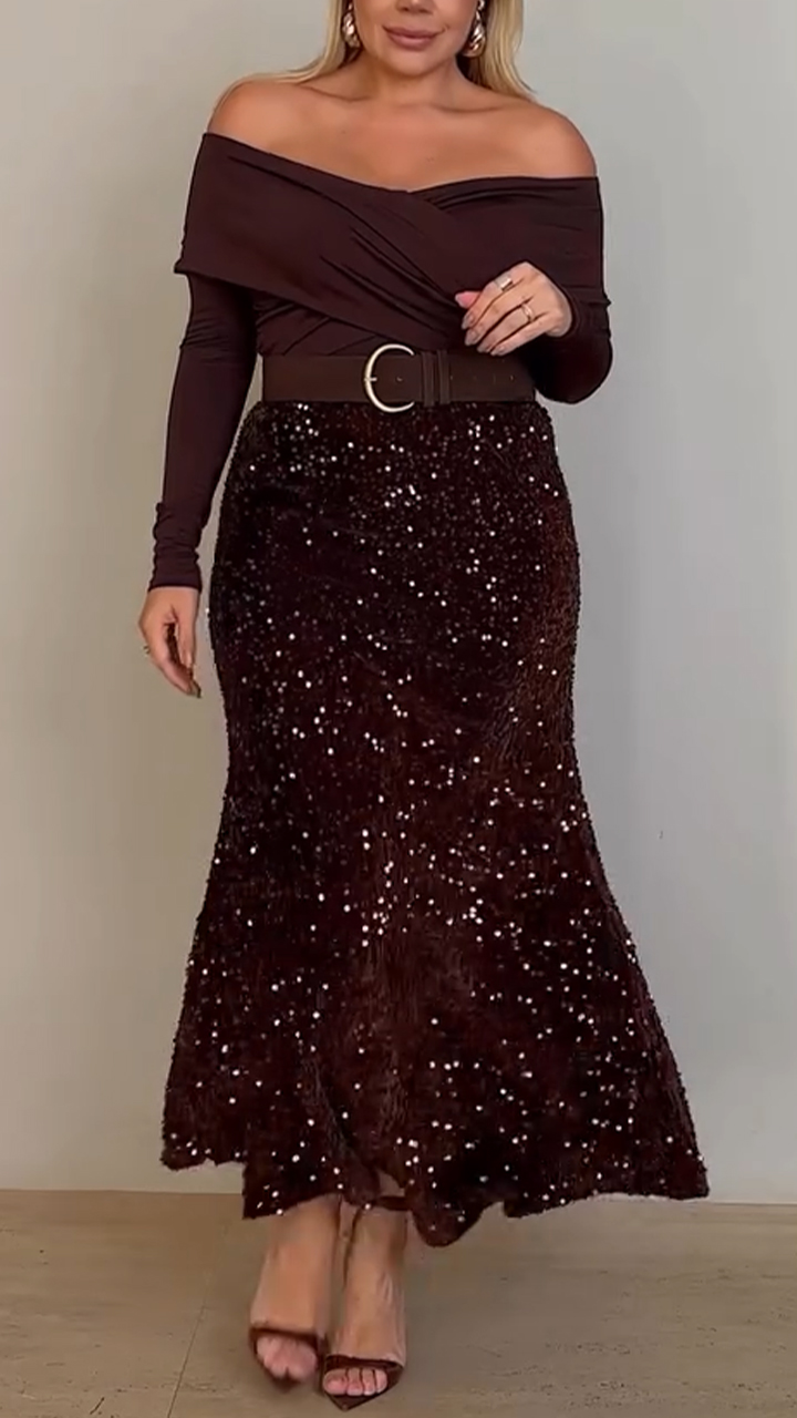 Women One-shoulder Top + Sequin Skirt Elegant Temperament Set