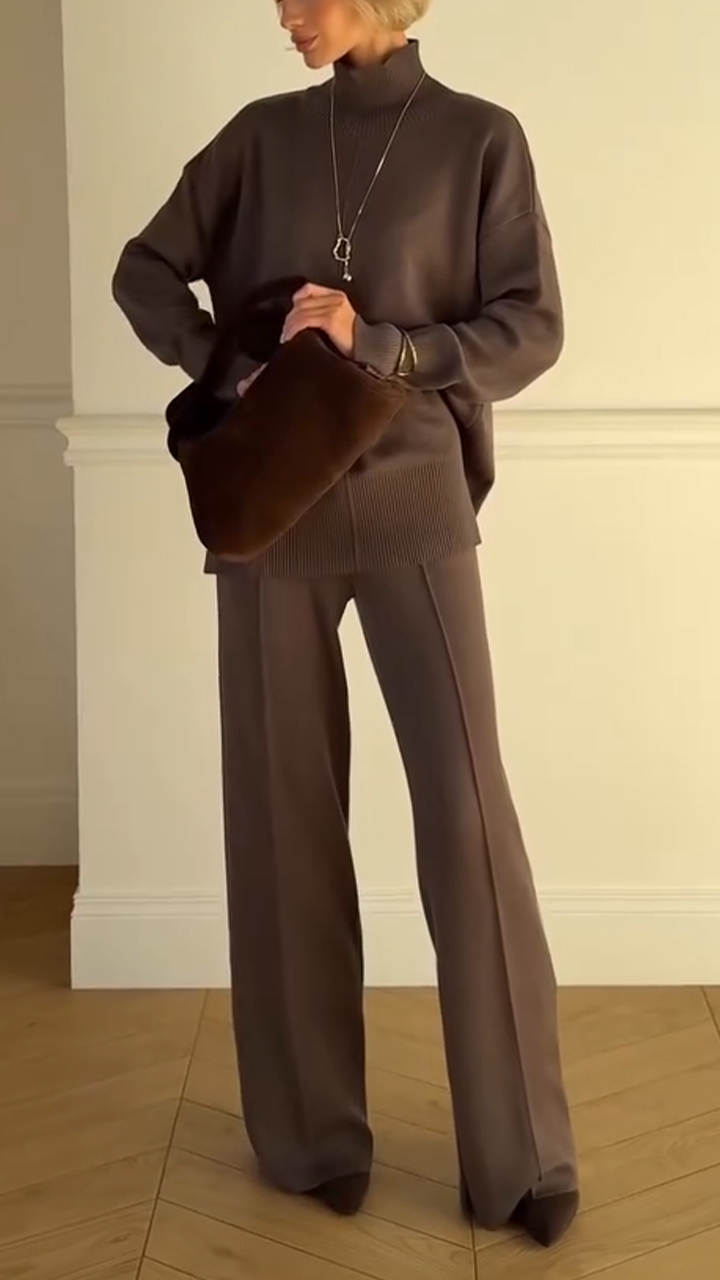 Women High Neck Knitted Sweater + Pants Casual Set