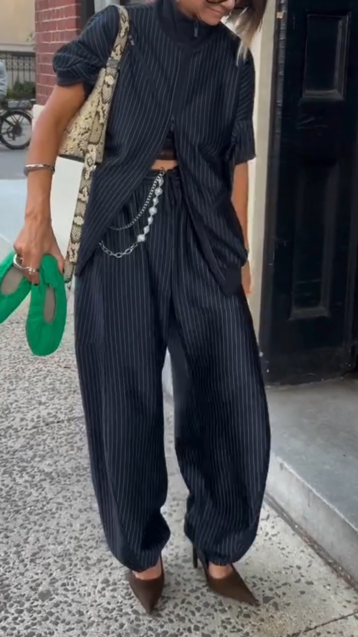 Women Stand-collar Striped Jacket and Pants Casual Set