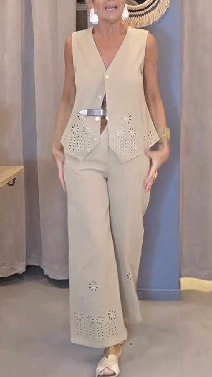 Women V-neck Pattern Hollowed Out Top+ Pants Casual Suit