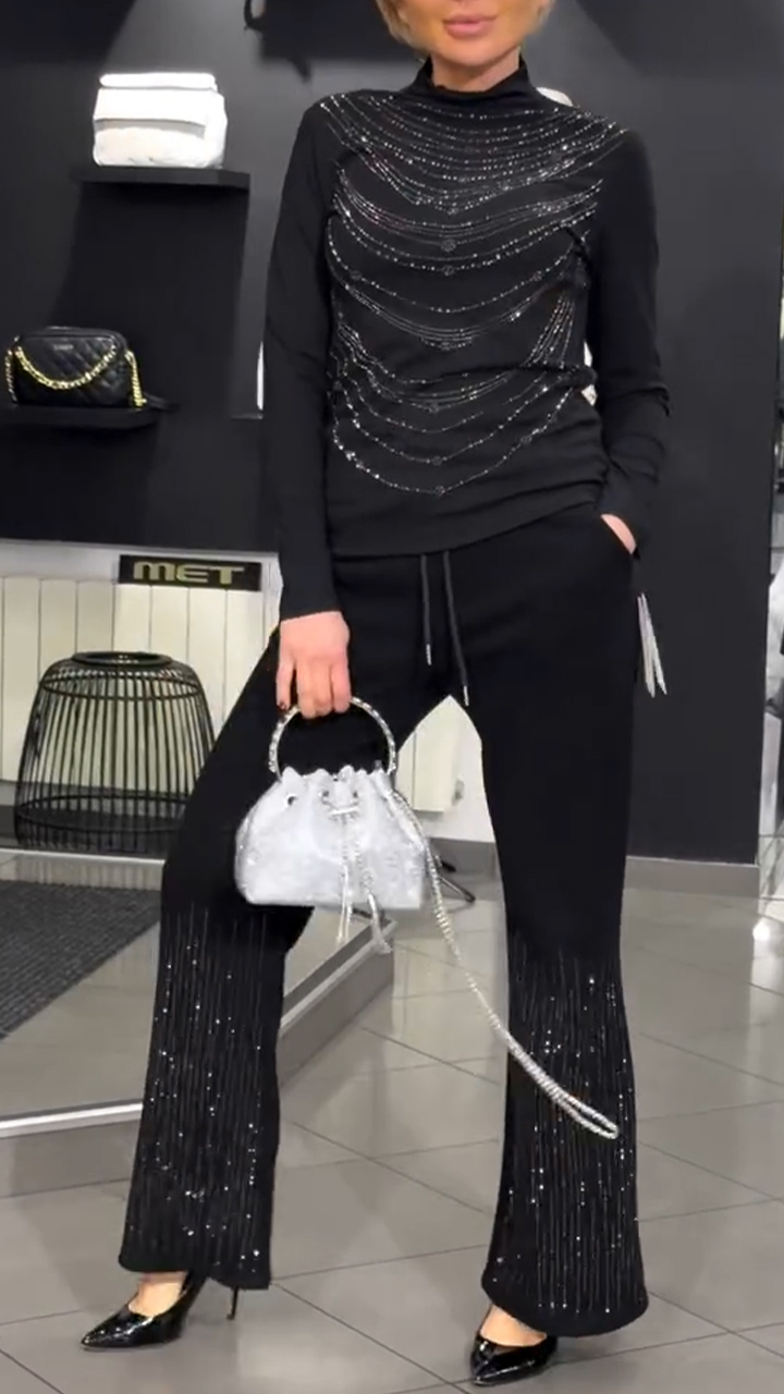 Women Round Neck Rhinestone Top + Pants Casual Set