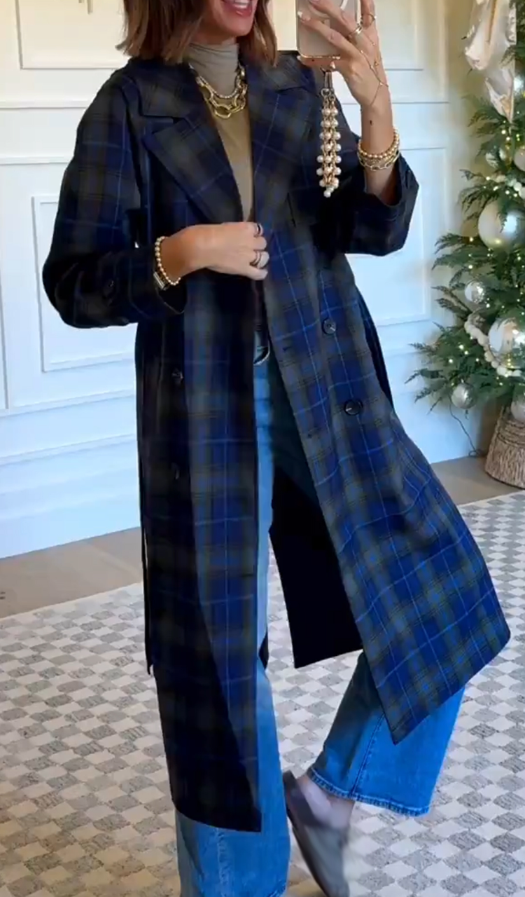 Women Laple Collar Plaid Casual Windbreaker with Temperament