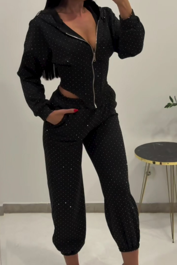 Women Casual Shiny Polka Dot Hooded Waist Zipper Sweatshirt Jacket + Cuffed Pants Suit