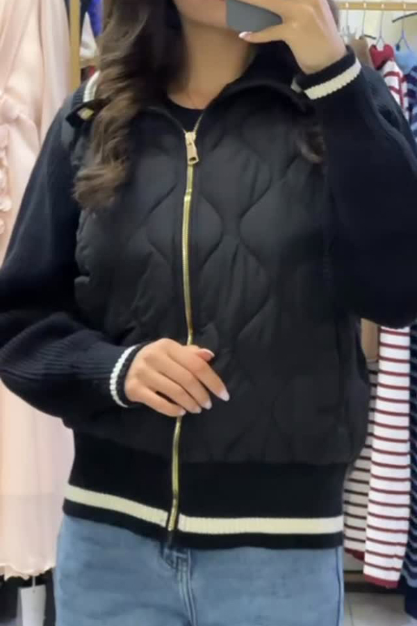 Women Stand Collar Splicing Cable Knit Sleeves Casual Cotton Jacket