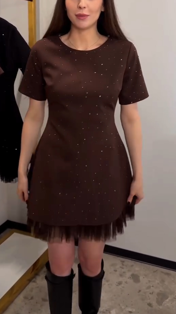 Women Round Neck Rhinestone Spliced Mesh Casual Dress