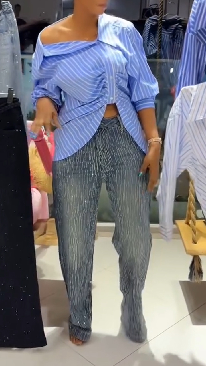 Womens Laple Collar Shirt+ Rhinestone Jeans Casual Set