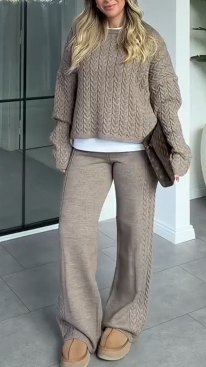 Women Round Neck Knitted Top + Pants Solid Color Casual Set