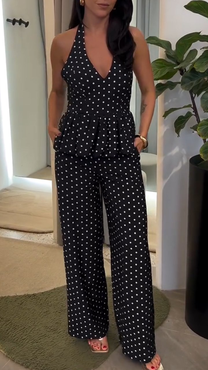 Women Halter-neck Sequined Top + Patchwork Printed Hollow Pants Temperament Casual Set