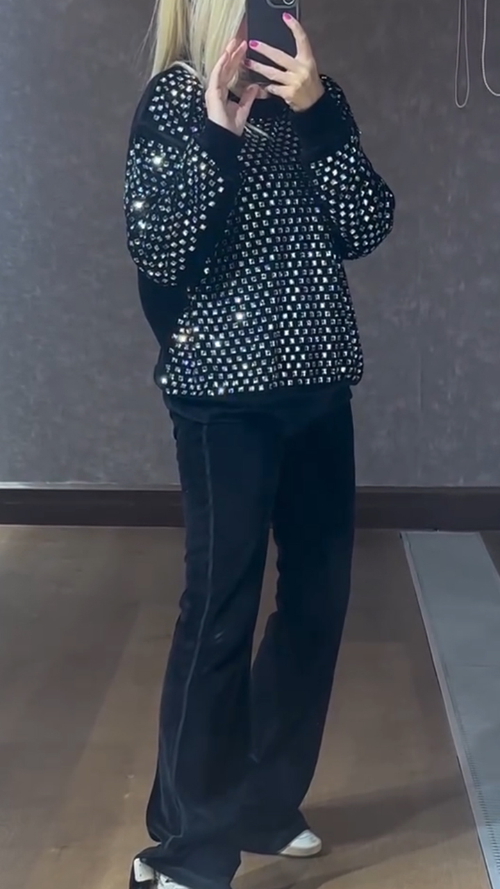 Women Round Neck Rhinestone Top + Slim-fit Trousers Temperament Casual Set