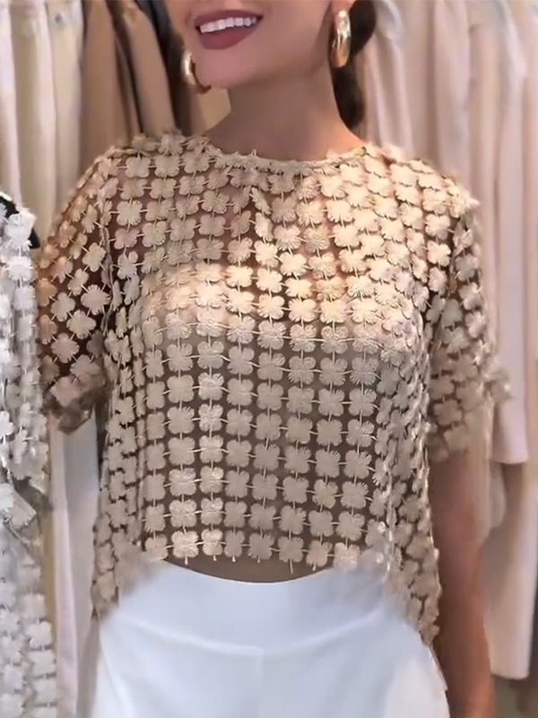 Womens Round Neck Floral Pattern Hollowed Out Casual Top