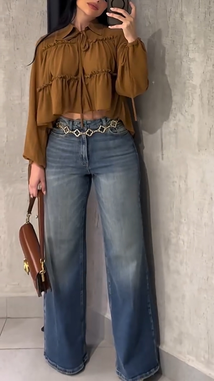 Women Lapel Patchwork Top + Washed Jeans Casual Suit