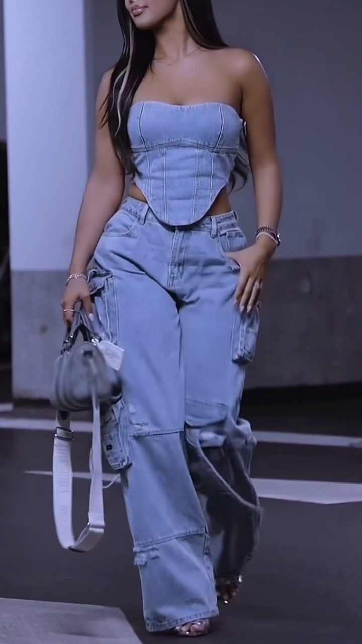 Womens Strapless Irregular Top+ Pants Casual Denim Suit